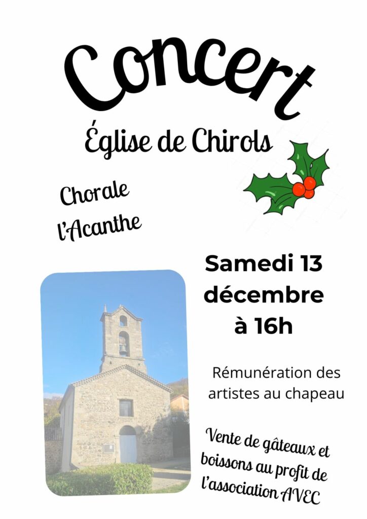 L’association AVEC a le plaisir de vous inviter le samedi 13 décembre à 16h dans l’église Chirols au concert de la chorale l’Acanthe .
